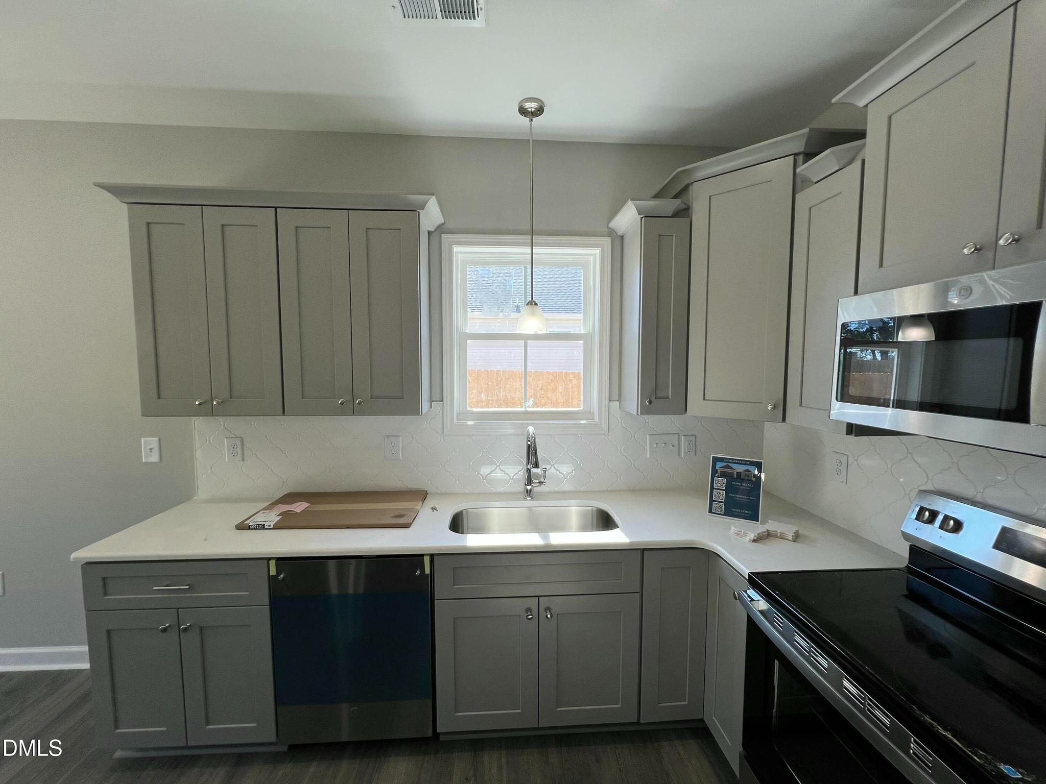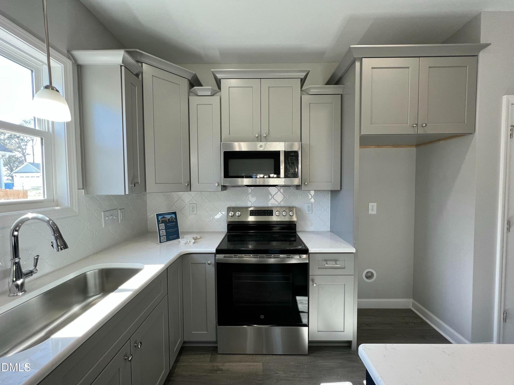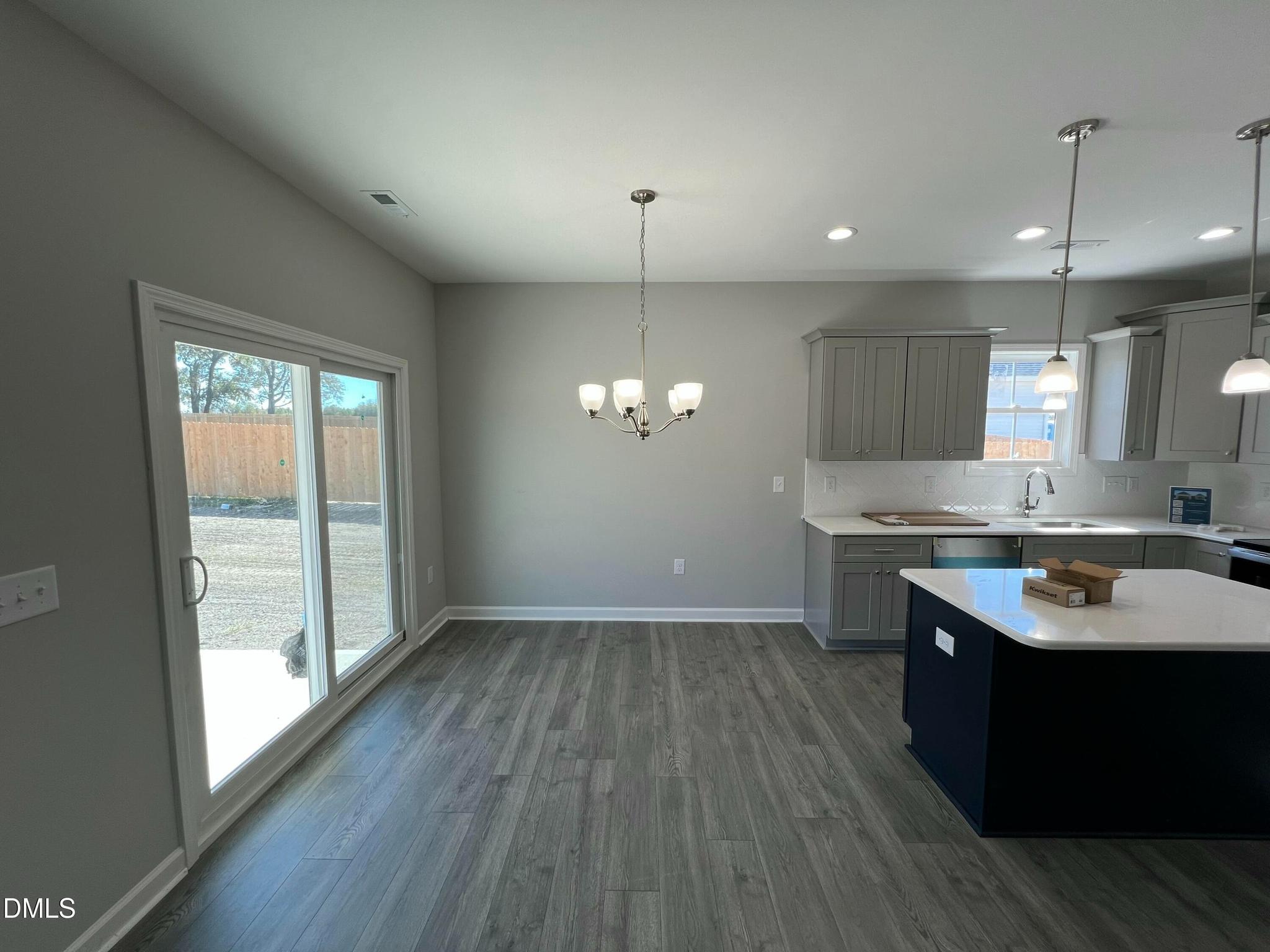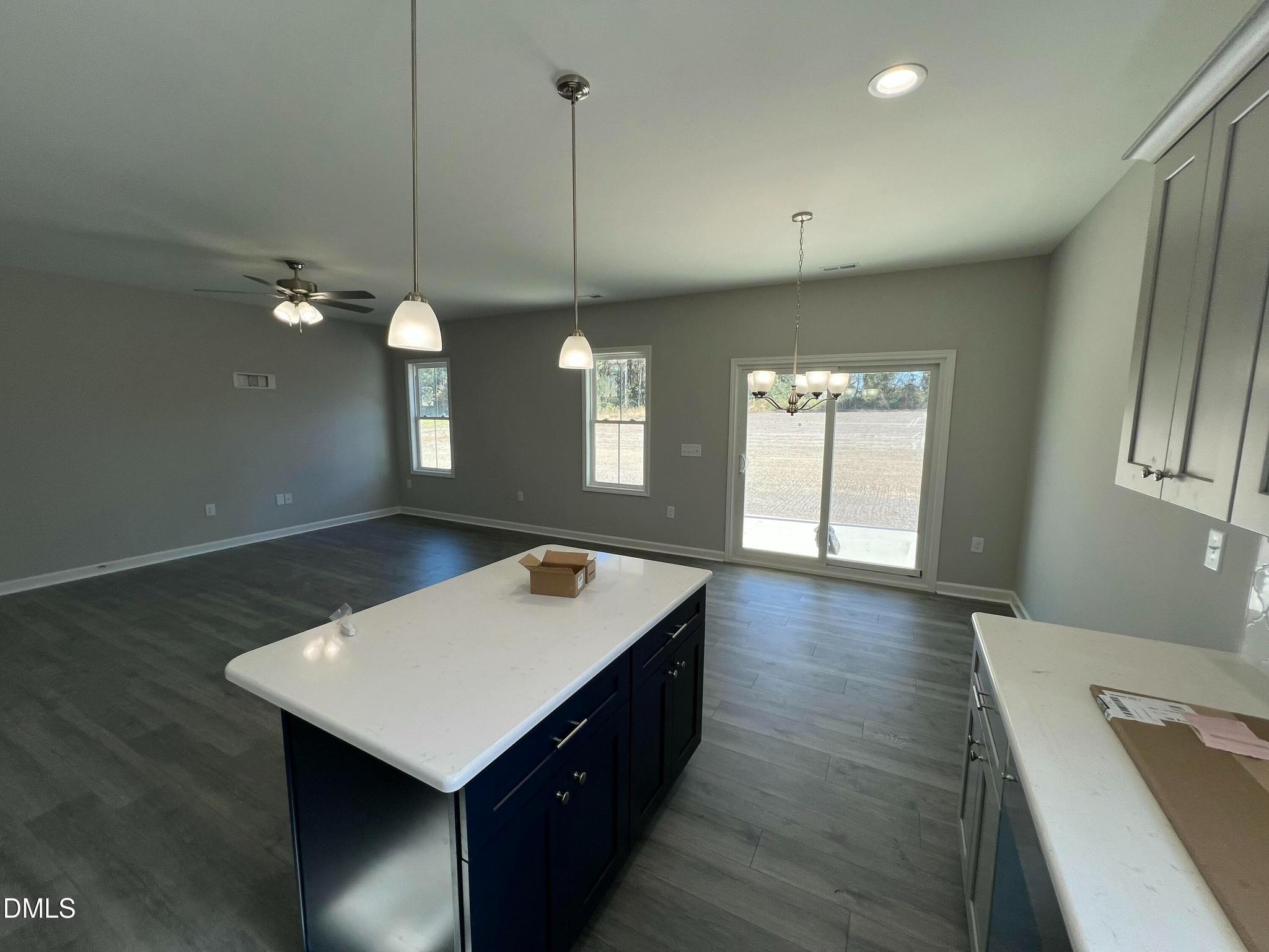 The bright family room opens seamlessly to the dining area and island kitchen, creating an ideal setup for entertaining or casual living. The kitchen boasts quartz countertops, stainless steel appliances, a pantry, and ample cabinet space.