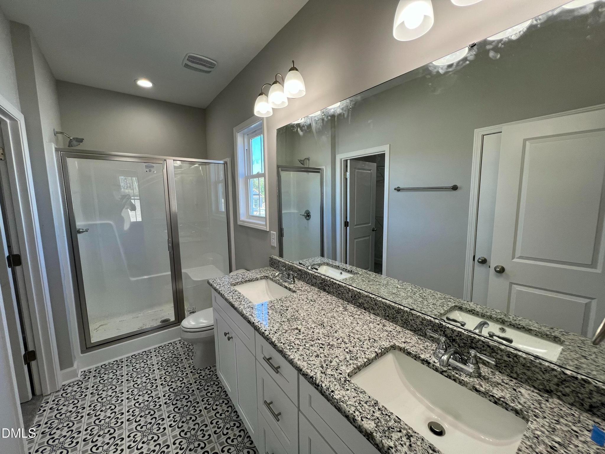 The owner’s suite provides a private retreat with dual vanities, a walk-in shower, and a spacious walk-in closet. Two additional bedrooms, a full bath, and a separate laundry room add convenience and functionality to the home.