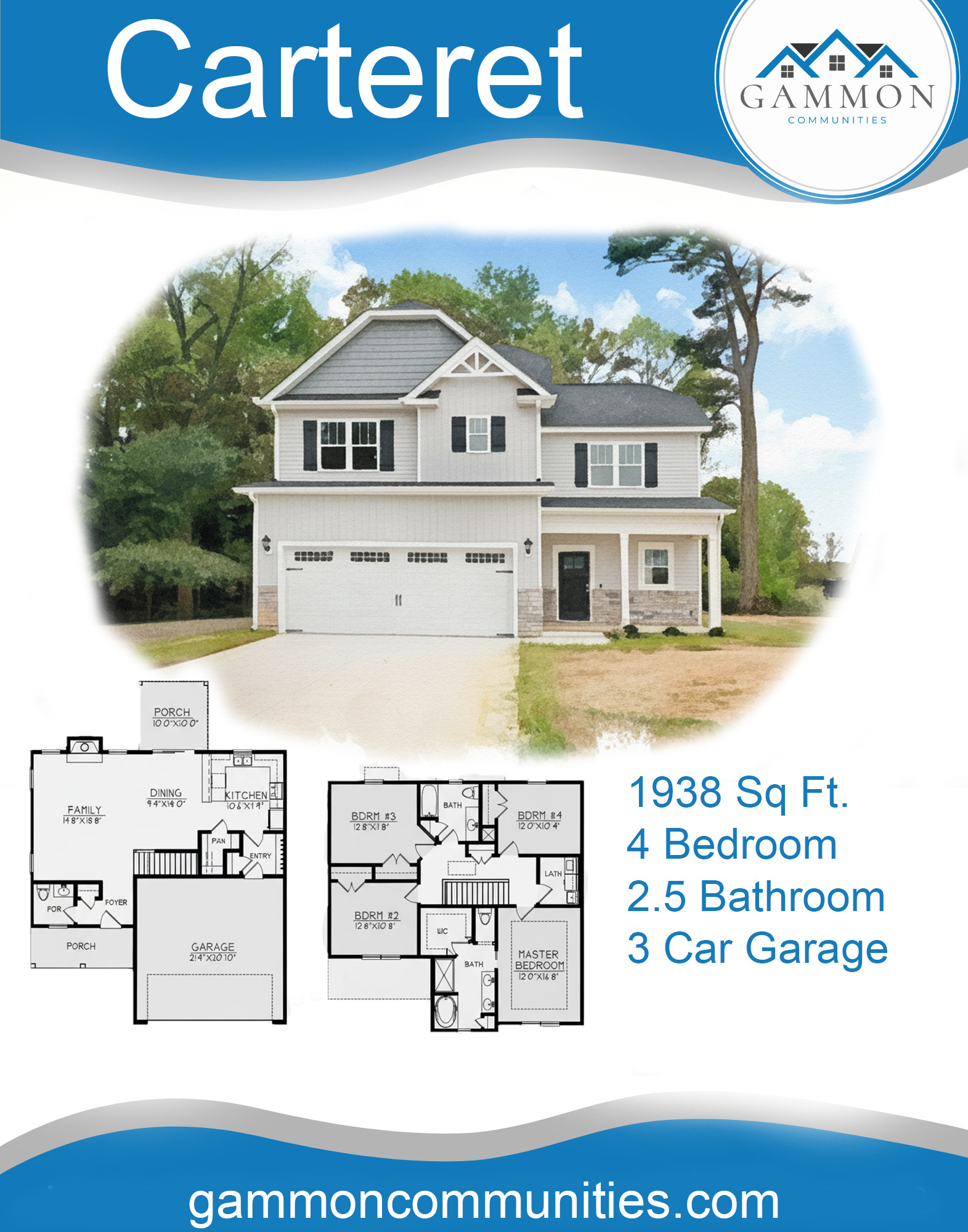 Additional features include a two-car garage with a drop-zone mudroom entry, covered front and rear porches, and a half bath on the main floor for guests. With thoughtful details, durable finishes, and an excellent location, the Carteret Plan perfectly balances comfort, style, and functionality.