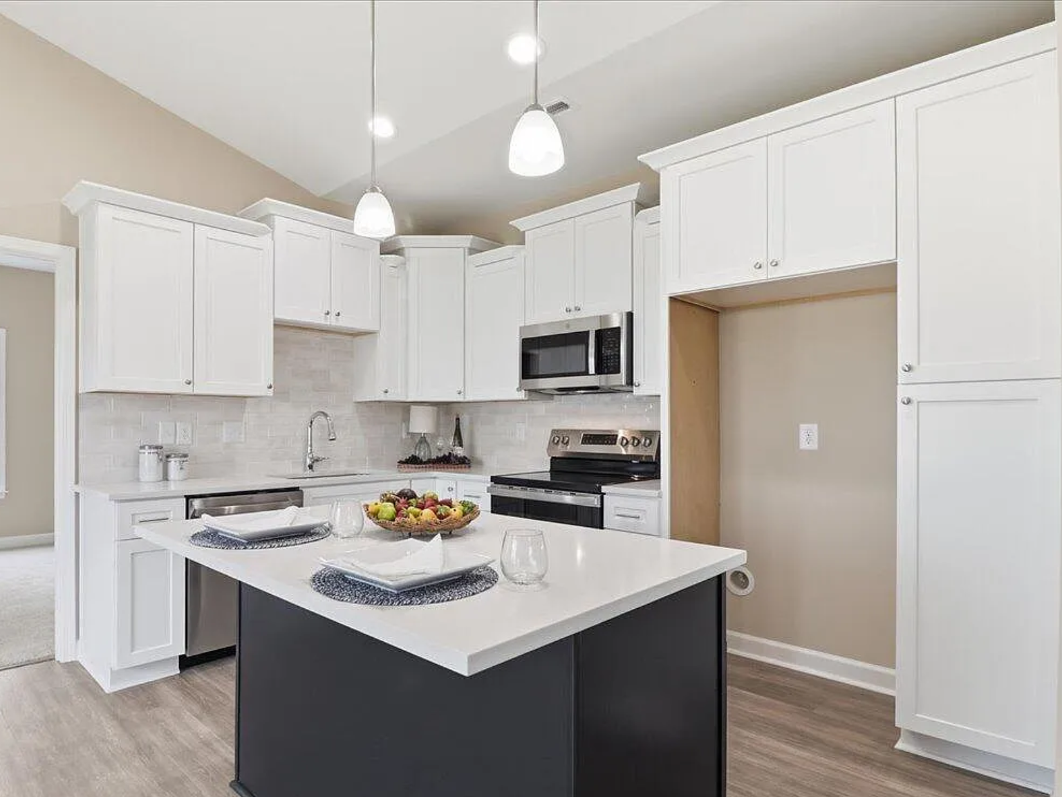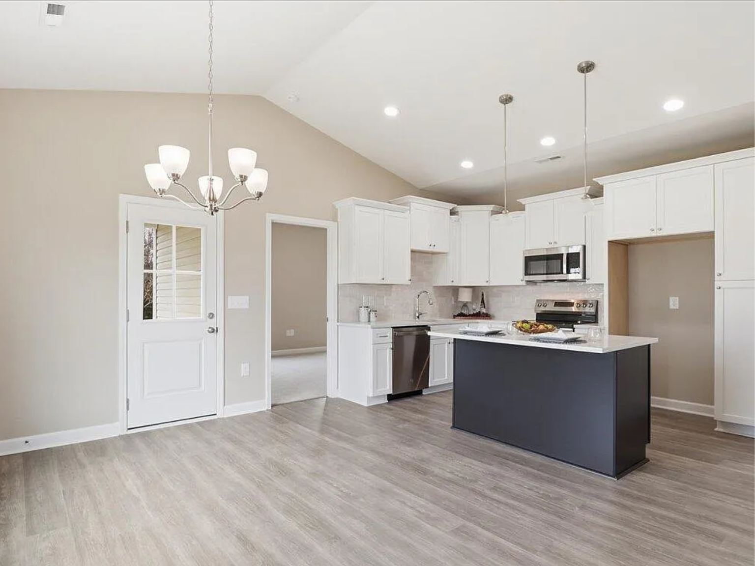 The open-concept layout seamlessly connects the spacious family room, sunny dining area, and gourmet island kitchen, creating an inviting flow ideal for both everyday life and entertaining. The kitchen includes quartz countertops, stainless steel appliances, tile backsplash, a pantry, and plenty of storage space.
