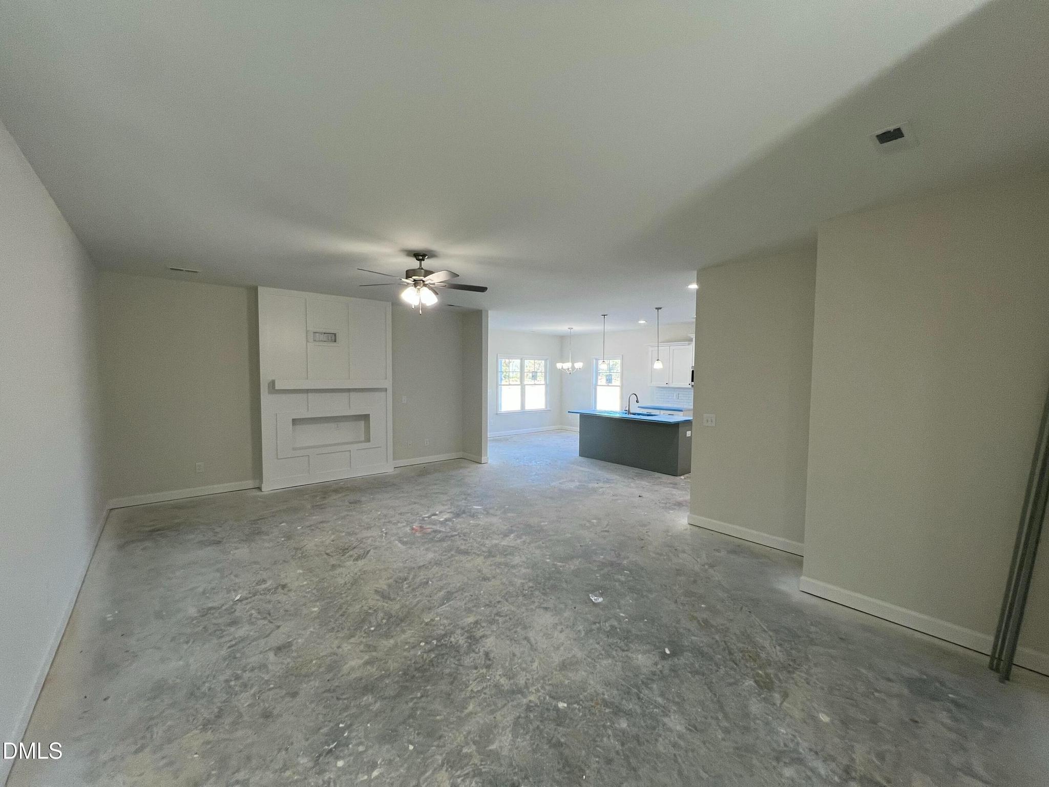 Step into a spacious living room featuring a cozy fireplace and elegant, low-maintenance flooring that extends throughout the main areas. The chef-inspired kitchen boasts granite countertops, a large island with breakfast bar seating, tile backsplash, stainless steel appliances, and a walk-in pantry—perfect for both casual meals and entertaining.