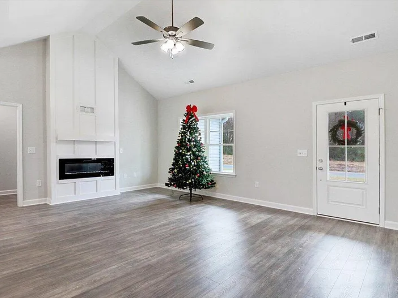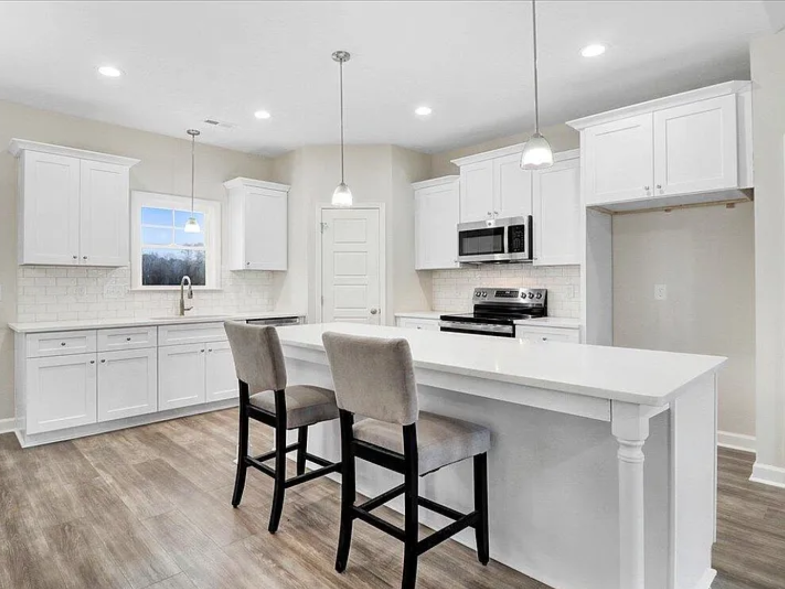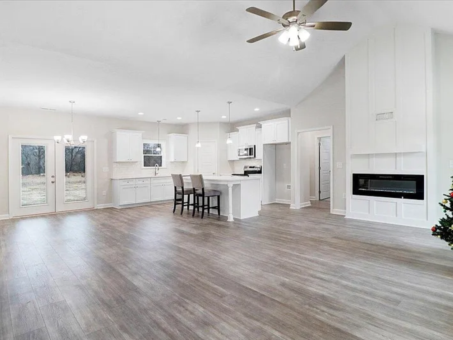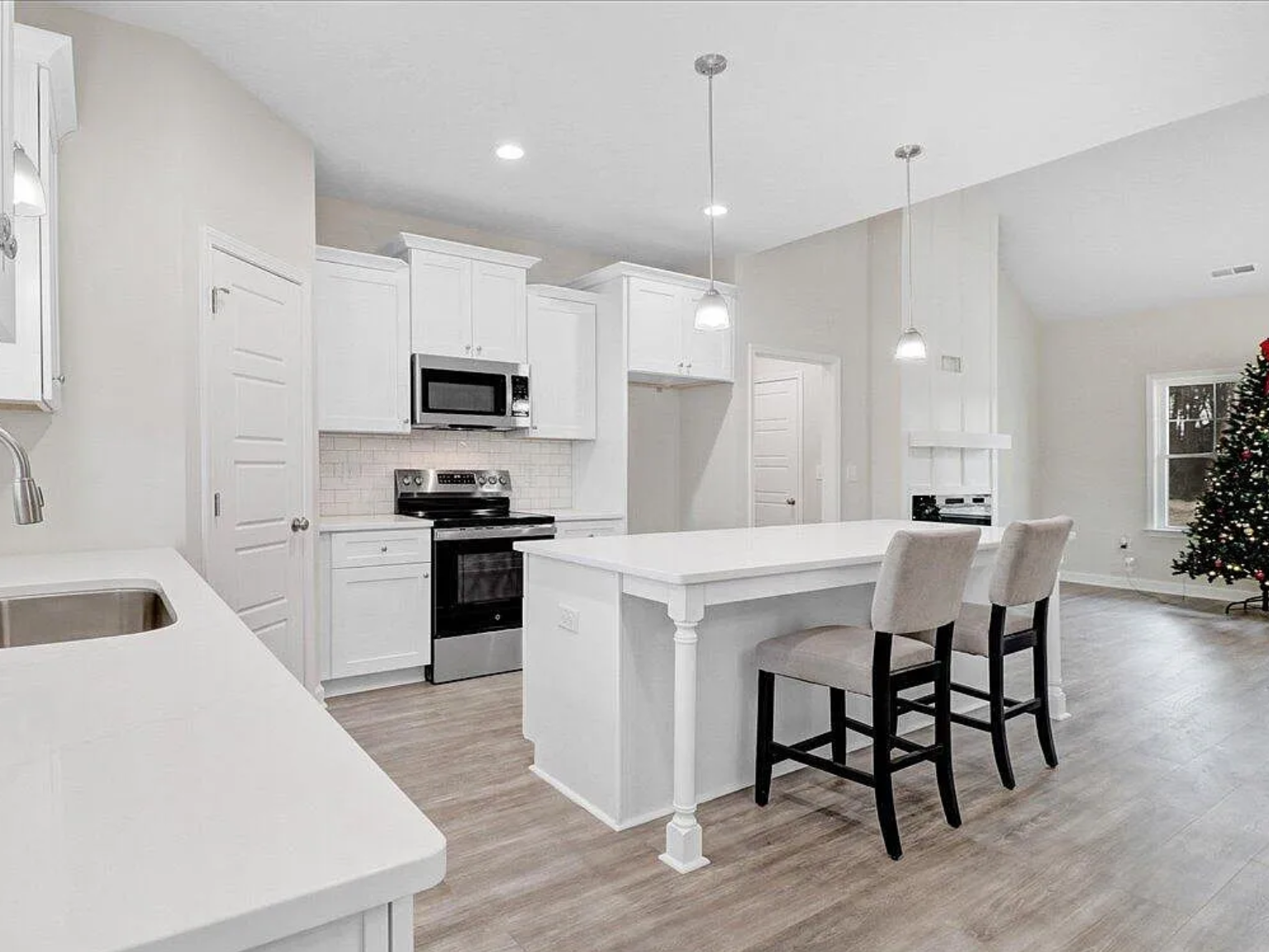 Step inside to an inviting open-concept layout where the spacious family room flows seamlessly into a stunning island kitchen. The kitchen features granite countertops, a tile backsplash, stainless steel appliances, durable laminate flooring, and plenty of prep space — perfect for entertaining or everyday living. Gather around the cozy fireplace for relaxing evenings at home.