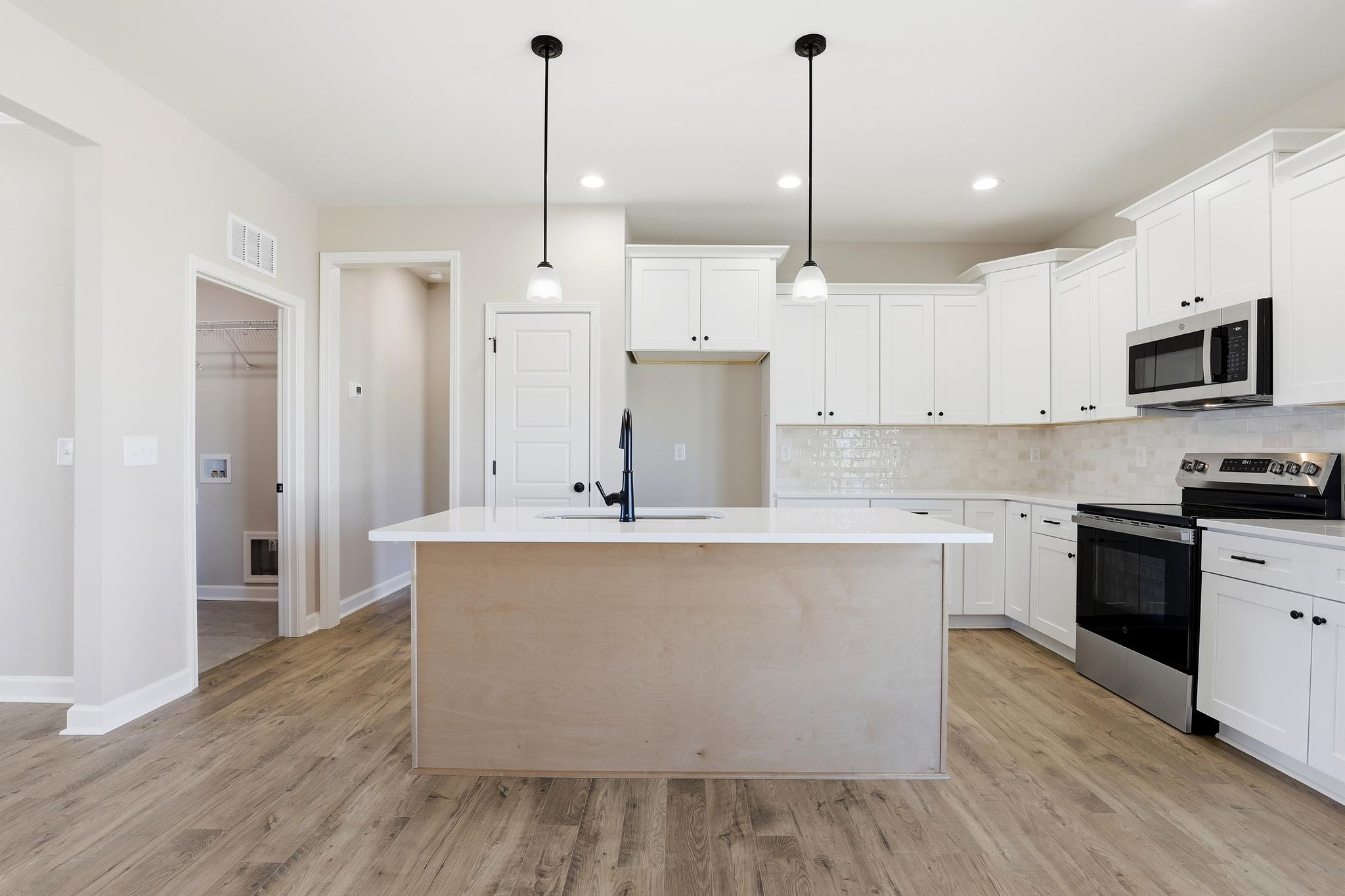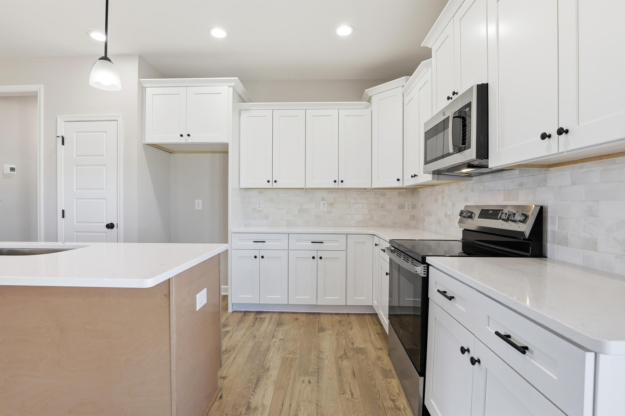 The inviting living area features an electric fireplace and luxury vinyl plank flooring throughout the main living spaces, combining comfort with durability. It flows seamlessly into a stunning kitchen complete with a generous island, quartz countertops, stainless steel appliances, tile backsplash, and premium soft-close cabinetry — an ideal space for cooking, entertaining, and everyday gatherings.