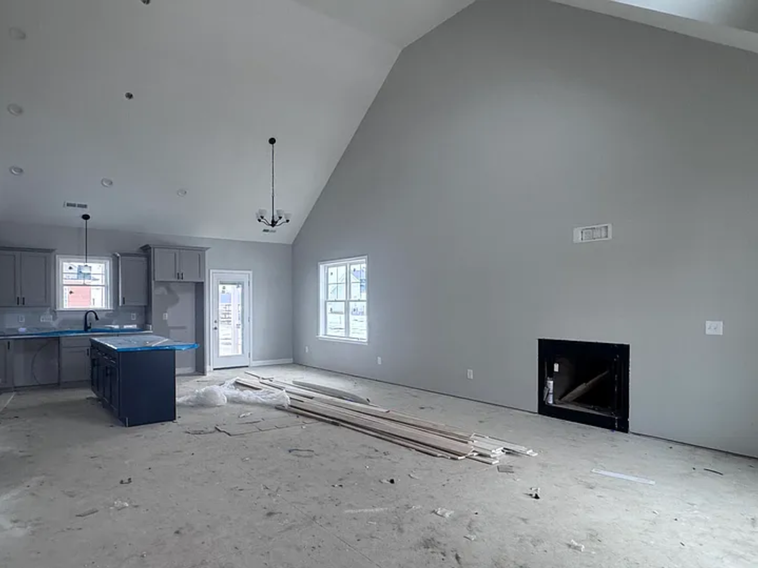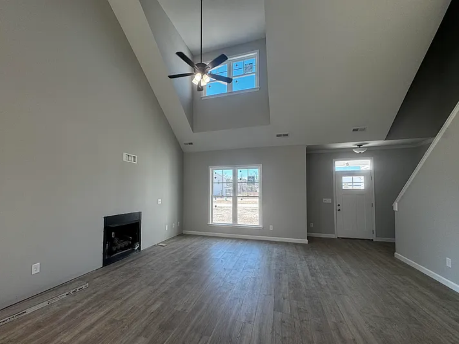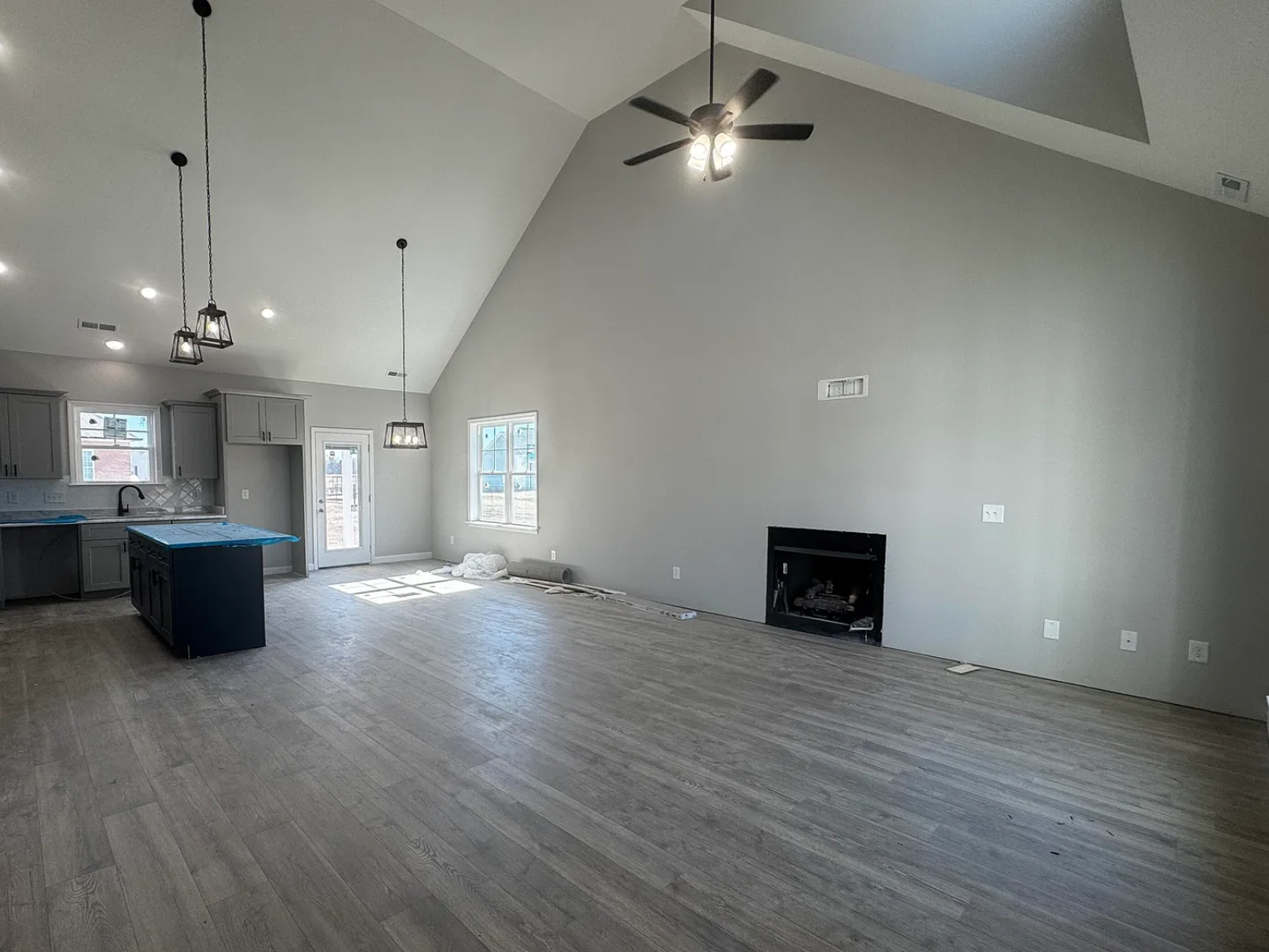 Step inside and immediately notice the soaring ceilings and open-concept layout that create a bright, airy feel throughout the main living spaces. The inviting family room features a cozy gas log fireplace, while the kitchen truly shines with a stunning tile backsplash, stainless steel appliances, a large breakfast bar, and soft-close cabinetry. Stylish upgraded black finishes and a separate dining area add a modern, elevated touch.