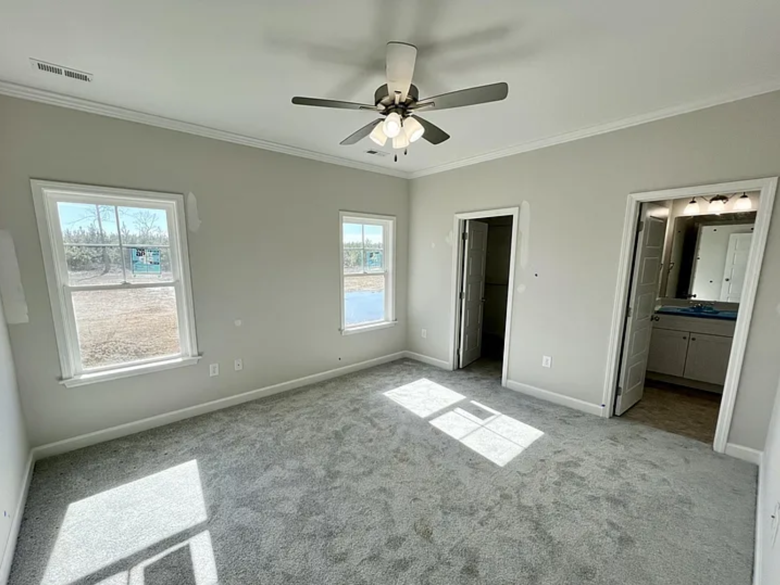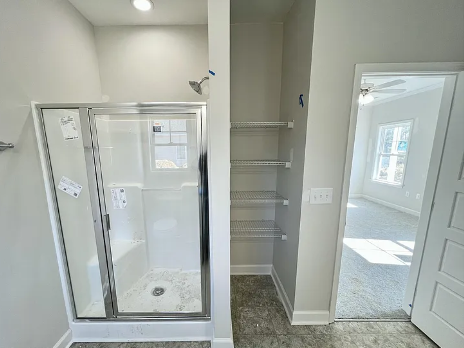 The kitchen features a stone island, quartz countertops, generous cabinet storage, and a pantry, all overlooking the main living space. The primary suite provides a private retreat with a walk-in closet, double vanities, and a walk-in shower. Two additional bedrooms are positioned near a full hall bath, complete with a linen closet for added storage.