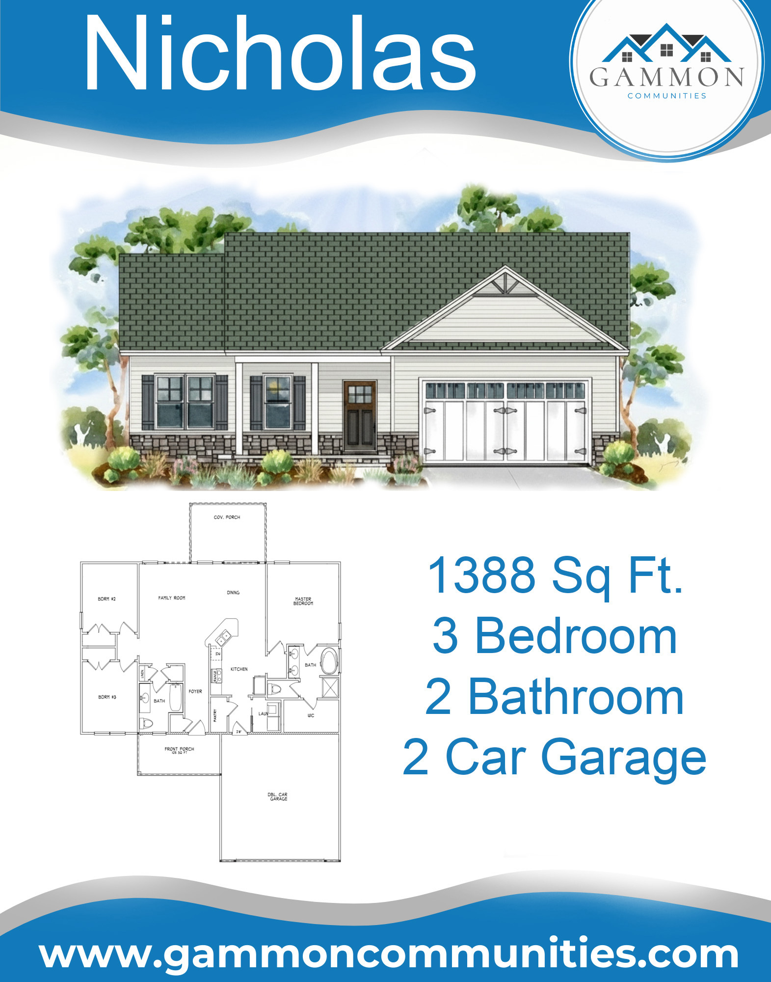 Experience the comfort and convenience of the Nicholas Plan, a well-designed new construction home offering 1,388 sq. ft. of smartly arranged living space. The kitchen features quartz countertops, a pantry, and a breakfast bar that opens directly into the dining area and generous family room—an ideal setup for both gatherings and day-to-day living.